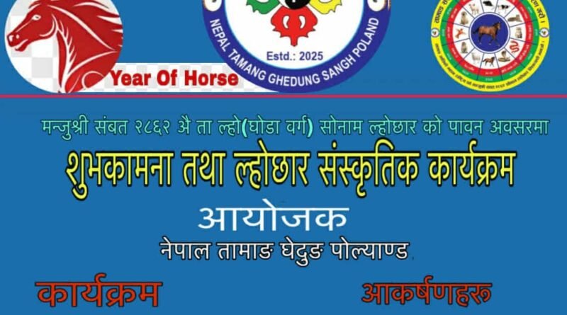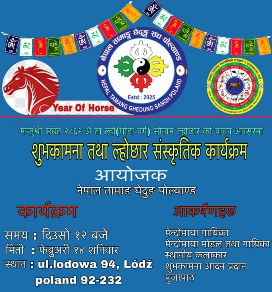 पोल्यान्डमा क्रियाशील संस्था नेपाल तामाङ घेदुङ पोल्यान्ड को आयोजनामा आउँदो फेब्रुअरी १४ तारिख का दिन राष्ट्रिय पर्व २८६२औं सोनाम ल्होछार (त ल्हो – घोडा वर्ग) को पावन अवसरमा शुभकामना आदान–प्रदान तथा बृहत सांस्कृतिक कार्यक्रम आयोजना हुने भएको छ।