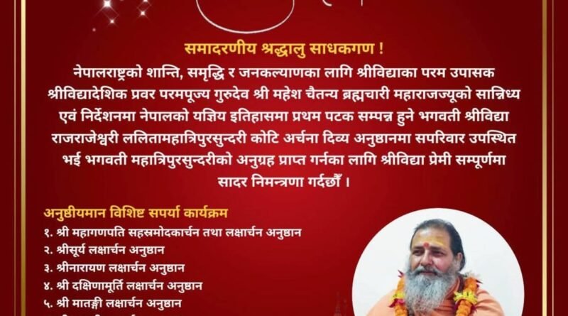 काठमाडौँ । पाशुपत क्षेत्रस्थित नेपाल वेदविद्याश्रम परिसरमा आगामी माघ २३ गतेदेखि फागुन ४ गतेसम्म (फेब्रुअरी ६ देखि १६ सम्म) ‘विश्वमेध श्रीविद्या ललितामहात्रिपुरसुन्दरी कोटि अर्चना महायज्ञ’ दिव्य महोत्सव आयोजना हुने भएको छ ।