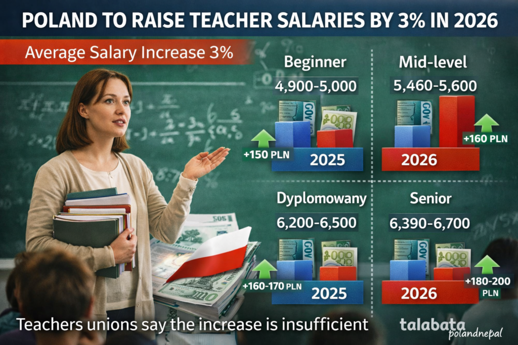 पोल्यान्ड सरकारले २०२६ सालका लागि शिक्षकहरूको आधार तलब औसत ३ प्रतिशतले वृद्धि गर्ने निर्णय गरेको छ। शिक्षा मन्त्रालयका अनुसार यो वृद्धि जनवरी १, २०२६ देखि लागू हुनेछ। सरकारले बजेट सन्तुलनलाई ध्यानमा राख्दै चरणबद्ध सुधार नीति अन्तर्गत तलब समायोजन गरिएको जनाएको छ।