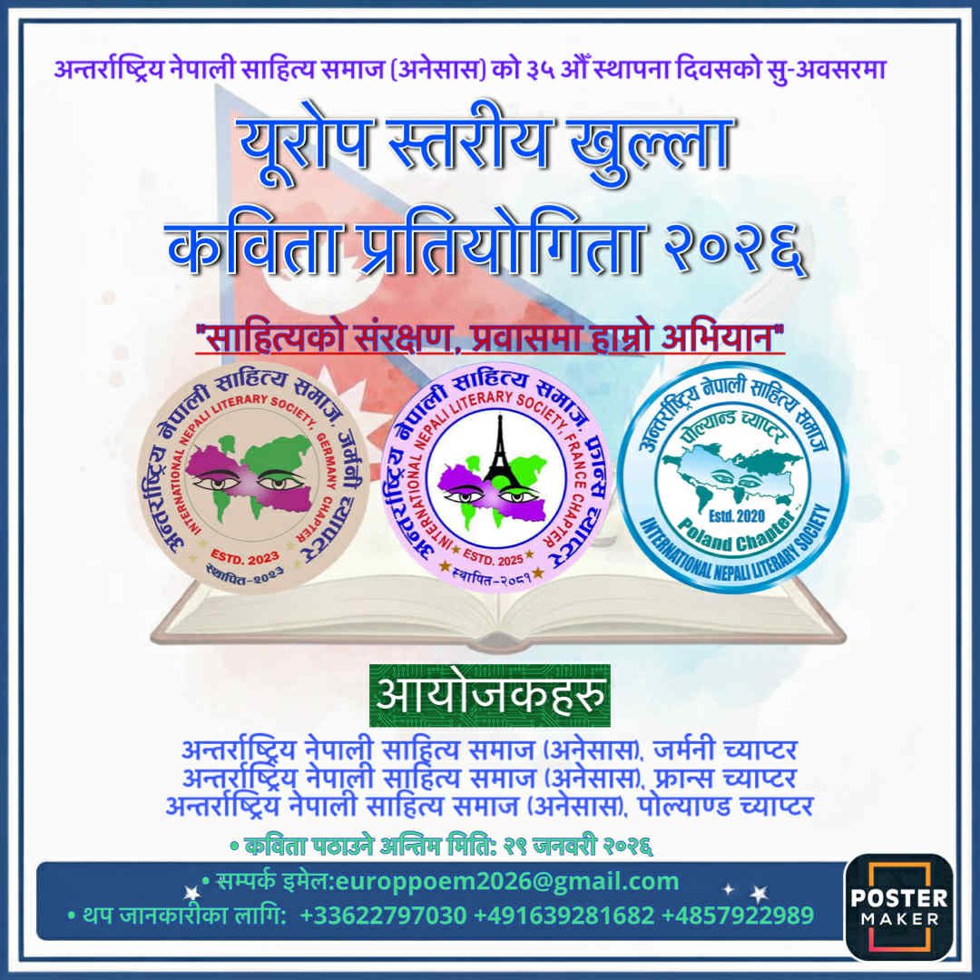 अन्तर्राष्ट्रिय नेपाली साहित्य समाज (INLS / अनेसास) को ३५औँ स्थापना दिवसको शुभ अवसरमा युरोपमा रहेका नेपाली साहित्यिक मनहरूलाई लक्षित गर्दै “युरोपस्तरीय खुल्ला कविता प्रतियोगिता २०२६” आयोजना हुने भएको छ।