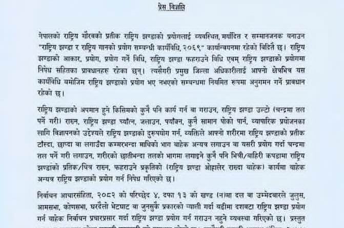 विज्ञप्तिमा उल्लेख गरिएअनुसार राष्ट्रिय झण्डा फाटेको, च्यातिएको, जमिनमा छोएको, ओछ्यान, कपडा, जुत्ता, पोस्टर, विज्ञापन, सजावट सामग्री वा कुनै पनि अपमानजनक अवस्थामा प्रयोग गर्न पाइँदैन। यस्तै, नाफामूलक व्यापारिक उद्देश्य, व्यक्तिगत प्रचारप्रसार वा मनोरञ्जनका सामग्रीमा राष्ट्रिय झण्डा प्रयोग गर्नु कानुनविपरीत हुने मन्त्रालयले स्पष्ट पारेको छ।