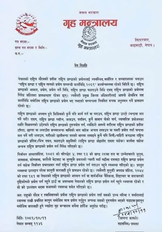 काठमाडौँ । नेपाल सरकार, गृह मन्त्रालयले राष्ट्रिय झण्डाको दुरुपयोग नगर्न सबै नागरिक, संघ–संस्था र निकायलाई कडा चेतावनी दिएको छ। मन्त्रालयले प्रेस विज्ञप्ति जारी गर्दै राष्ट्रिय झण्डा प्रयोगसम्बन्धी प्रचलित कानुन, नियम र निर्देशिका अनिवार्य रूपमा पालना गर्न आग्रह गरेको हो।